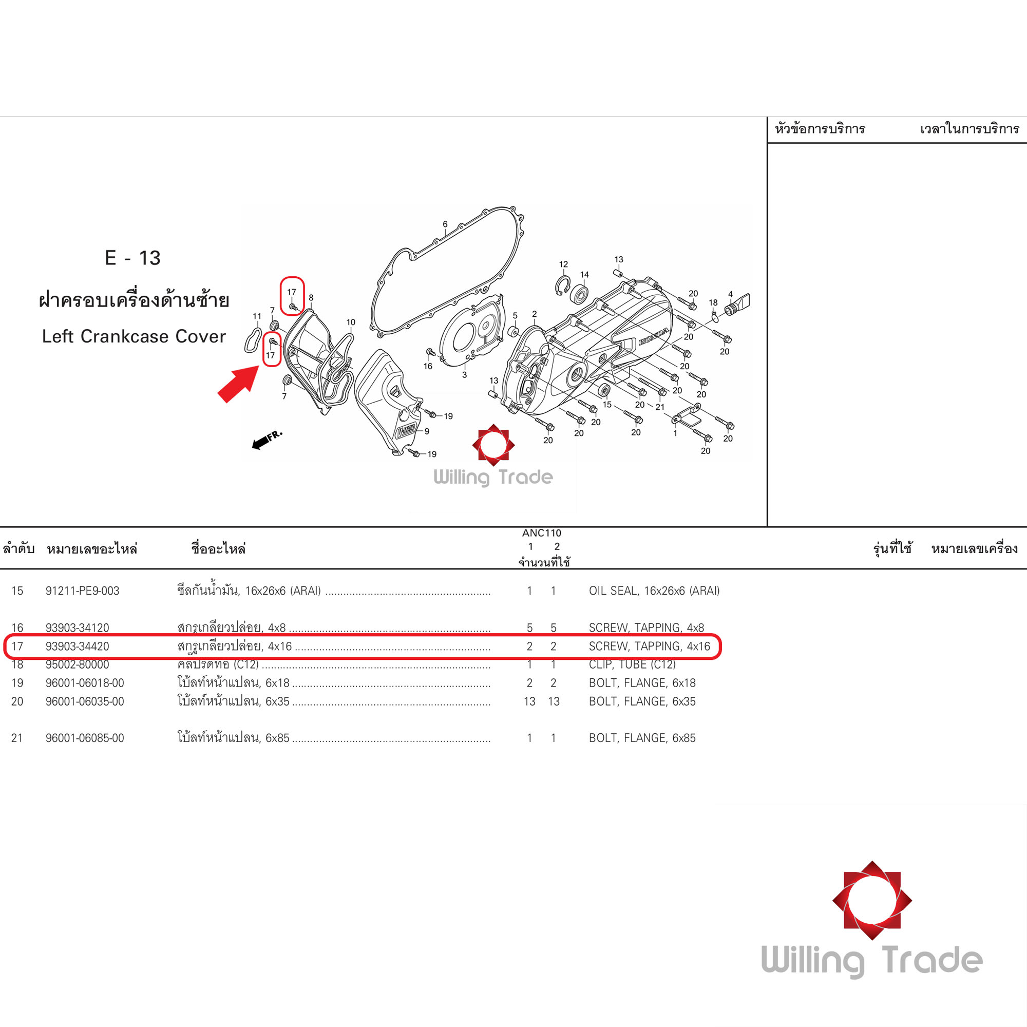 สกรูเกลียวปล่อย 4x16 (WX754) HONDA: (93903-34420) CLICK-I ... แพ๊คละ 1 ชิ้น... [แท้ศูนย์ 100%] ...ฝาครอบเครื่องด้านซ้าย ... SCREW,.TAPPING,.4x16