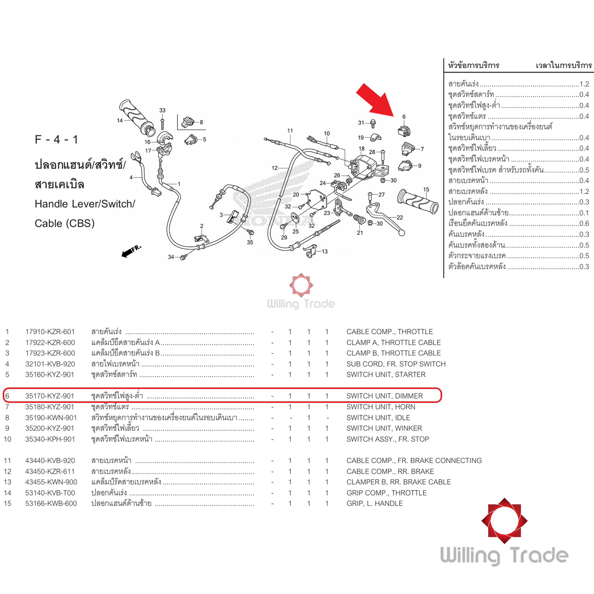 ชุดสวิทช์ไฟสูง-ต่ำ (WY0119) HONDA: (35170-KYZ-901) CLICK 125I ... แพ๊คละ 1 ชิ้น... [แท้ศูนย์ 100%] ... กลุ่มอะไหล่ปลอกแฮนด์/สวิตช์/สายเคเบิล ... SWITCH UNIT, DIMMER