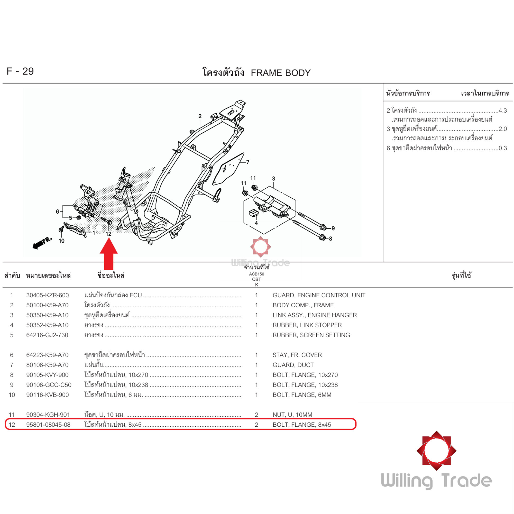 โบ้ลท์หน้าแปลน, 8x45 (WY225) HONDA: (95801-08045-08) CLICK150-I แพ๊คละ 1 ชิ้น... [แท้ศูนย์ 100%] ... กลุ่มอะไหล่โครงตัวถัง ... BOLT, FLANGE, 8x45