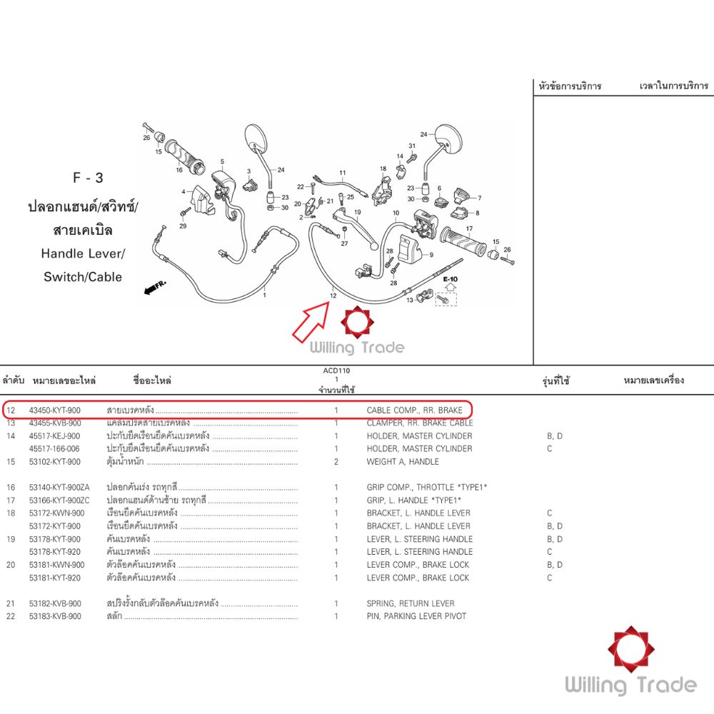 สายเบรคหลัง (WY244) HONDA: (43450-KYT-900) SCOOPY-I แพ๊คละ 1 ชิ้น... [แท้ศูนย์ 100%] ... กลุ่มอะไหล่ปลอกแฮนด์/สวิตช์/สายเคเบิล...CABLE COMP., RR. BRAKE