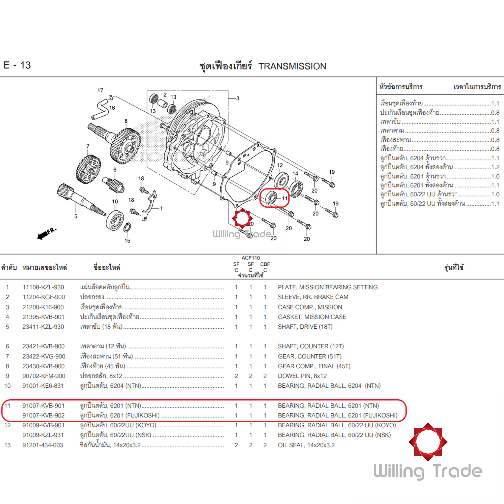 • หมายเลขอะไหล่ (Part number): 91006-KZR-601 แทนเบอร์ 91007-KVB-901