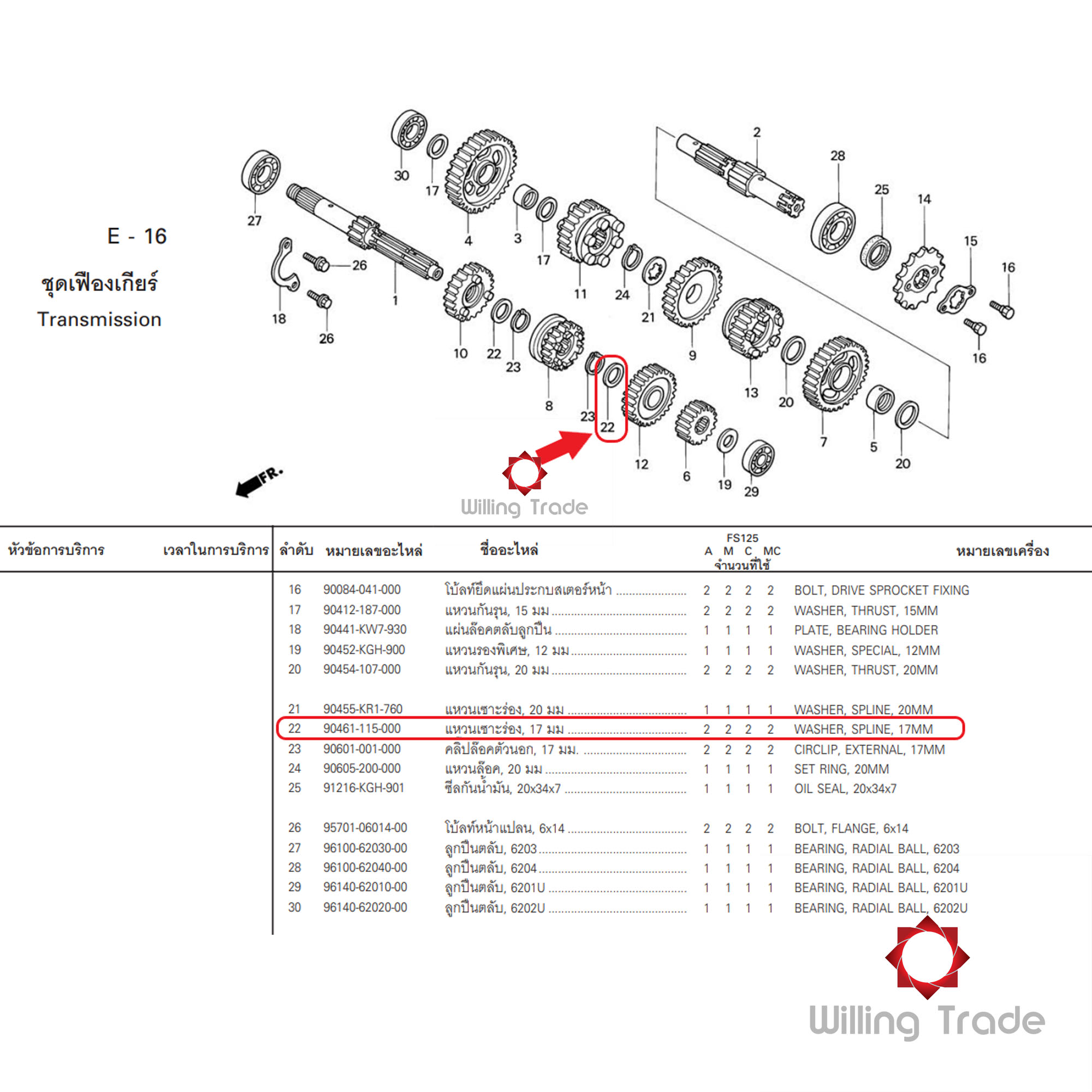 แหวนเซาะร่อง 17 มม (แหวนรองมีลิ้นในตัว 17 มม) (WX533) HONDA: (90461-115-000): SONIC NEW-OLD, NOVA ... แพ๊คละ 1 ชิ้น... [แท้ศูนย์ 100%] ...กลุ่มอะไหล่ชุดเฟืองเกียร์ ... WASHER, SPLINE, 17MM